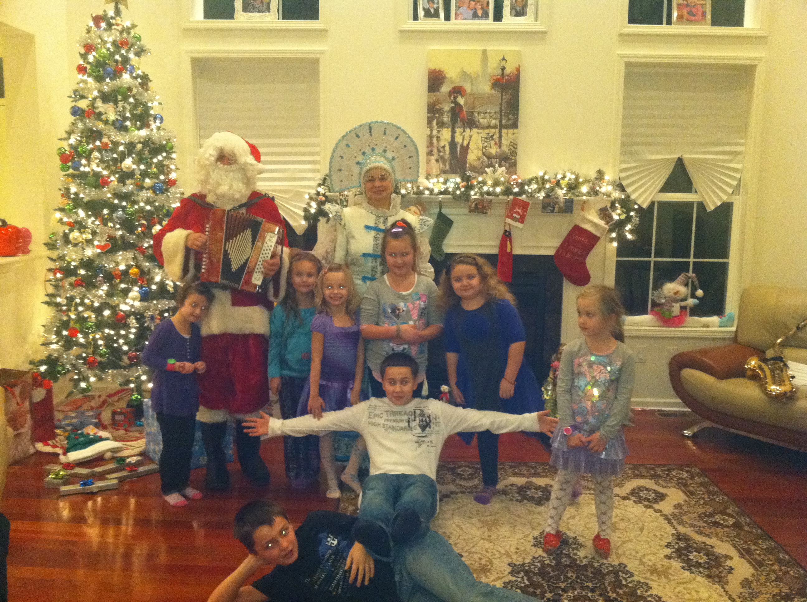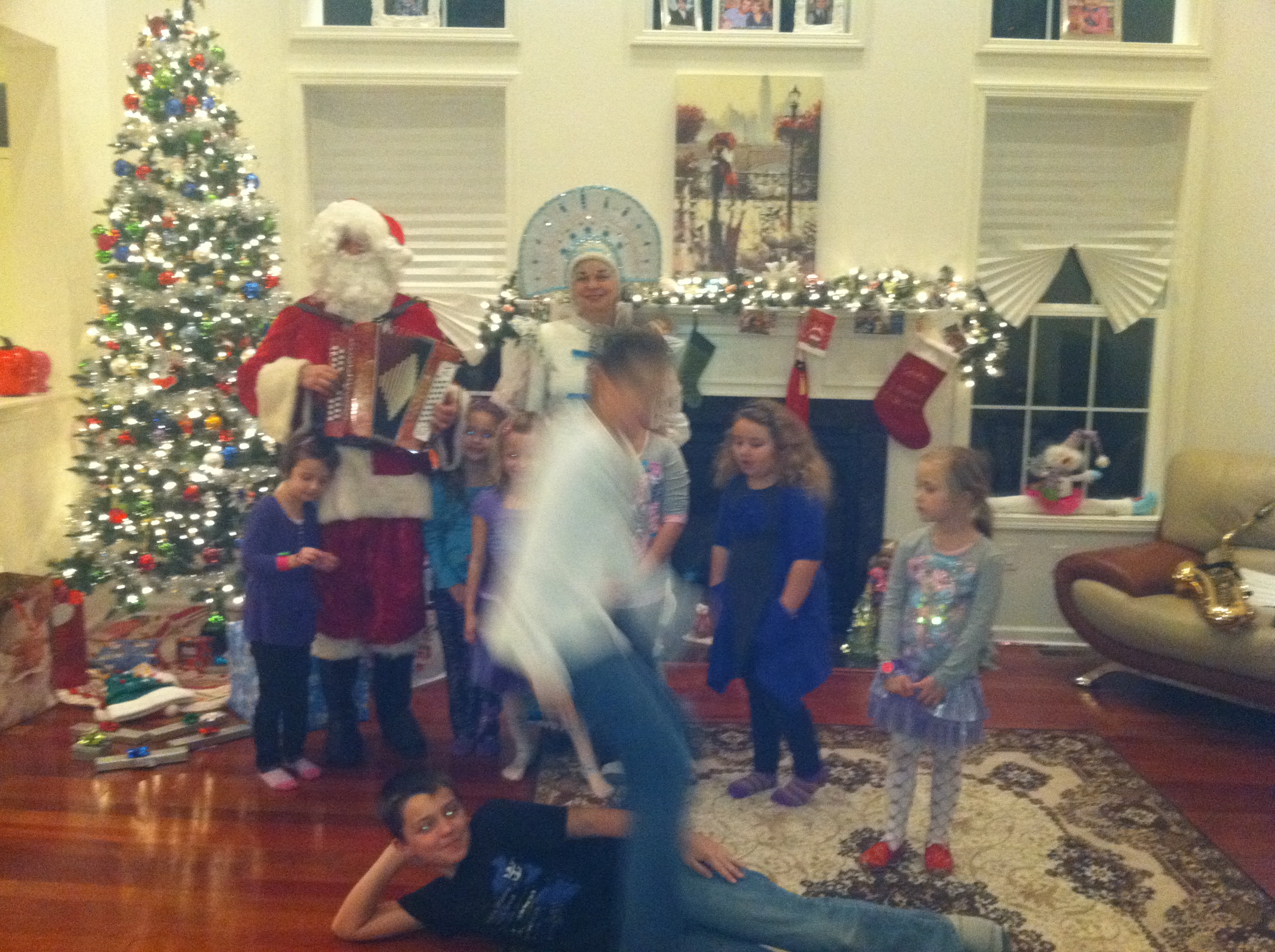 On December 23, 2012 around 5pm Ded Moroz and Snegurochka presented one hour Russian New Year show program for kids and adults in Manalapan, New Jersey. The program of visit included games, trivias, songs, dances, live performances on folk instruments. Detailed description of the visit is available below in Russian and English. Both (Ded Moroz and Snegurochka) are bilingual. The program can be performed in Russian, English or both languages. Визит Деда Мороза и Снегурочки это весёлое увлекательное представление для детей, которое включает в себя стихи, игры, загадки, песни, хороводы, вручение подарков, фотосессию, живое исполнение на народных инструментах и немного волшебства.