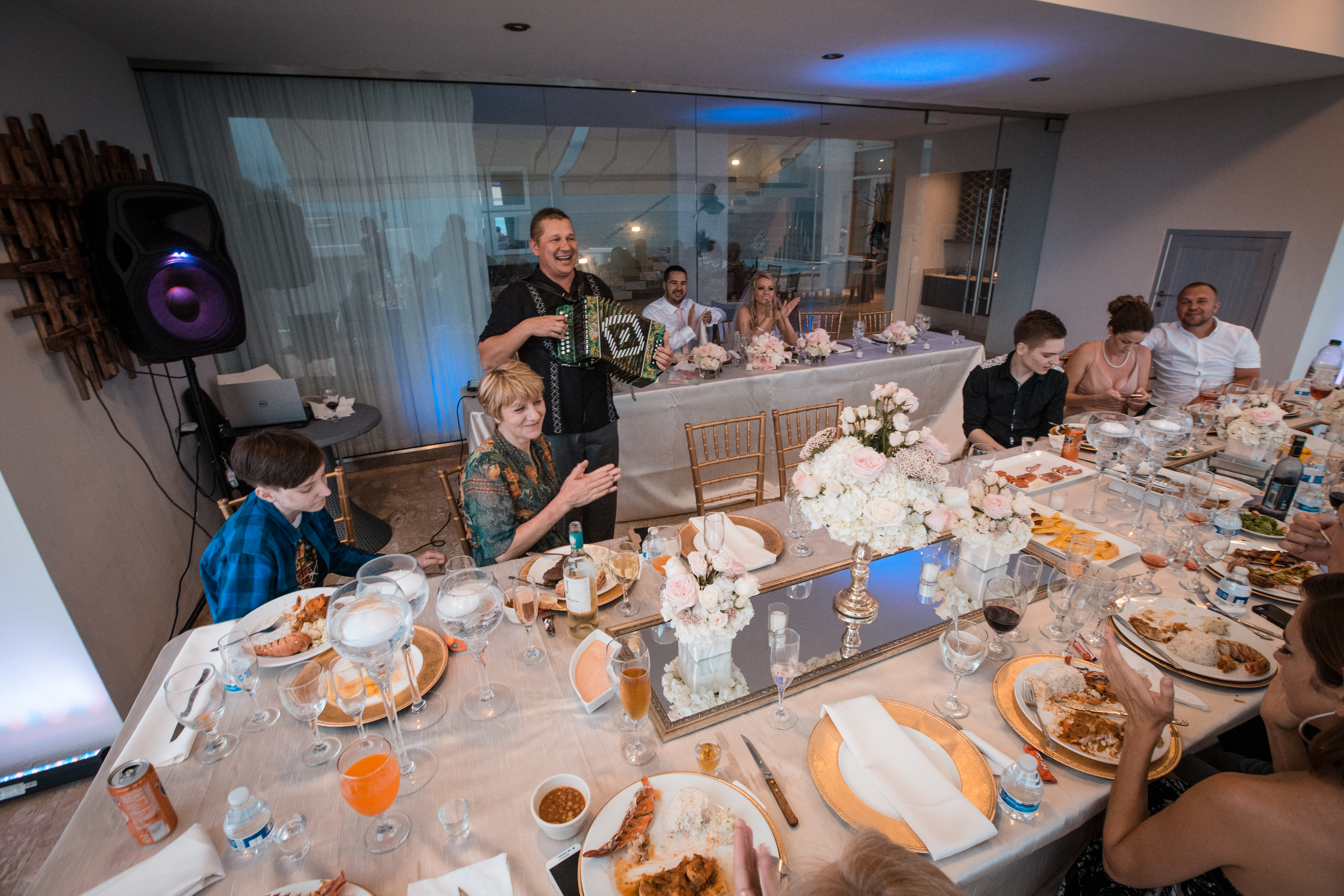 Caribbean destination wedding took place in Casa Herdz, Aguadilla, Puerto Rico at the Luxurious Beachfront Villa, real HEAVEN IN THE CARIBBEAN… huge 7 Bedroom palace with private beach and INFINITY POOL. Music music for dancing for listening/dancing and bilingual MC entertainment (announcements, fun games, trivias, competitions, jokes, etc) was provided by singer, owner of Barynya Entertainment, bilingual (Russian and English) Master Of Ceremonies and tamada Mikhail from New York.